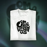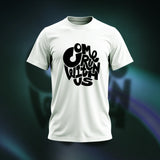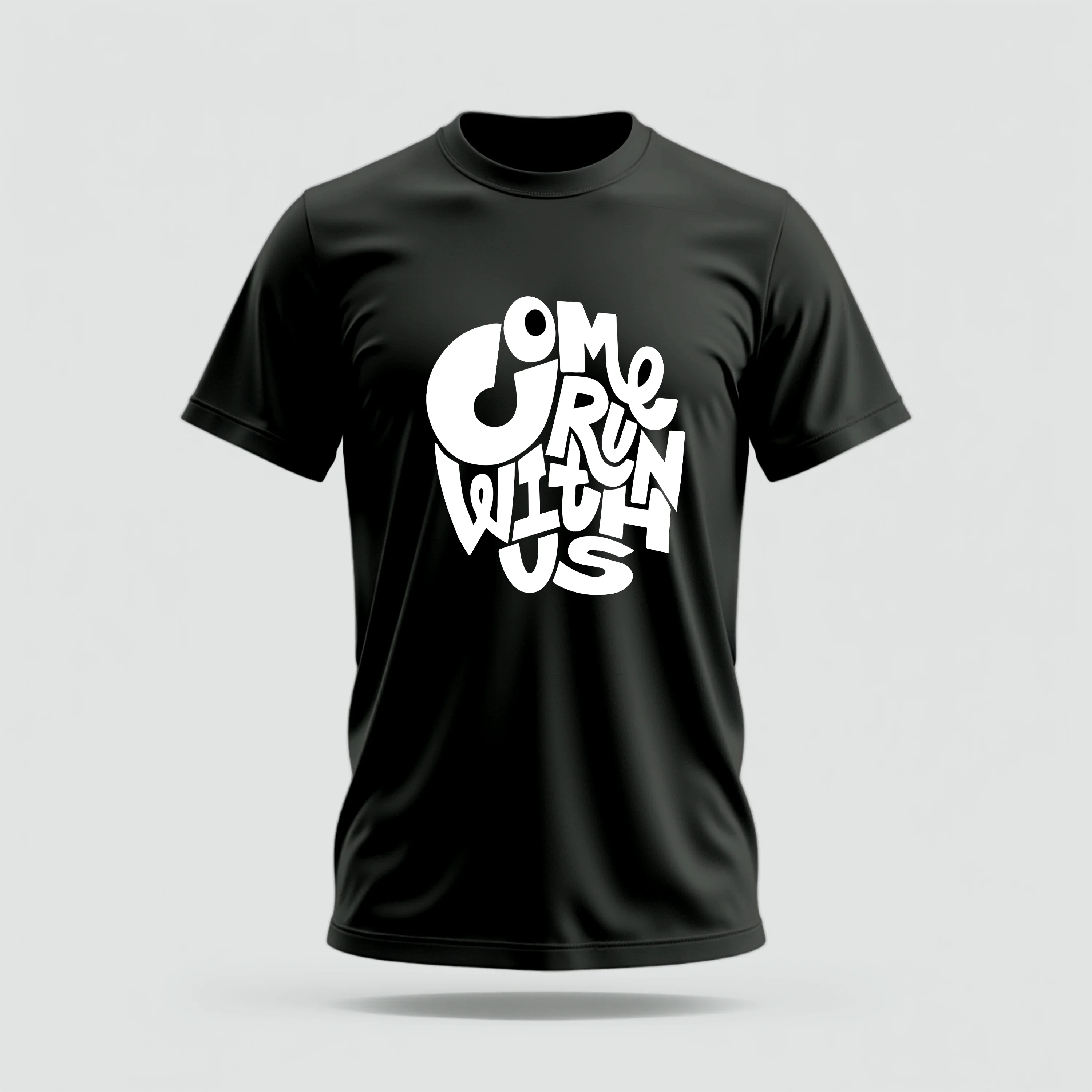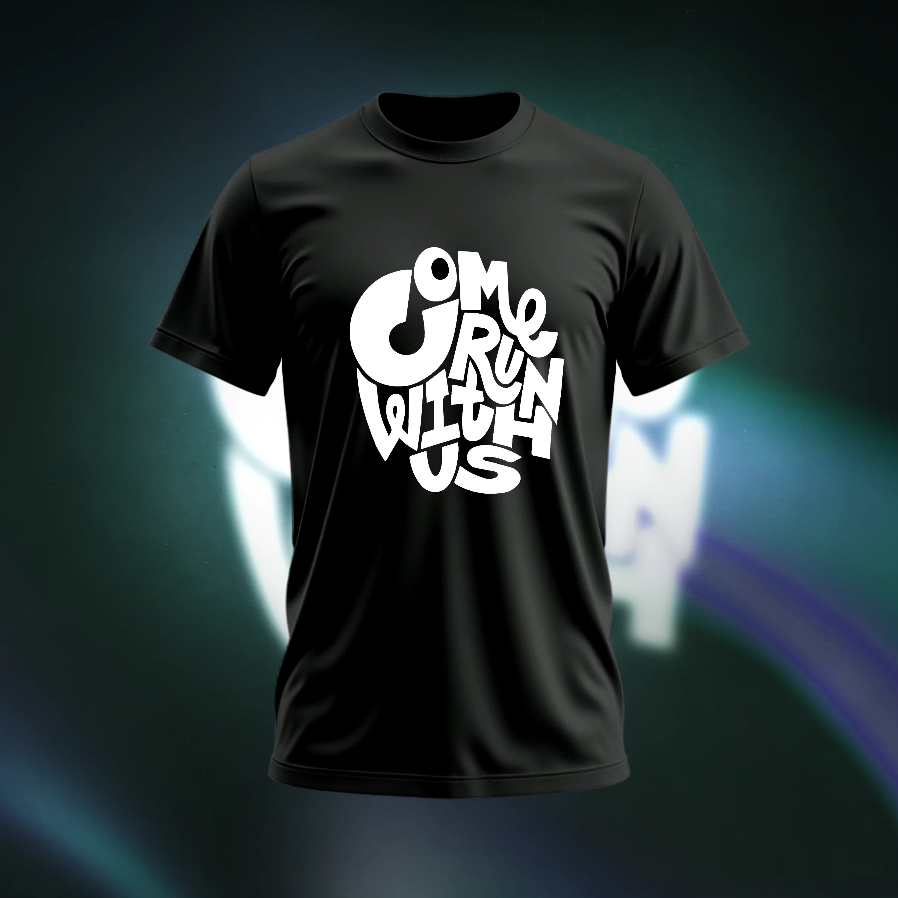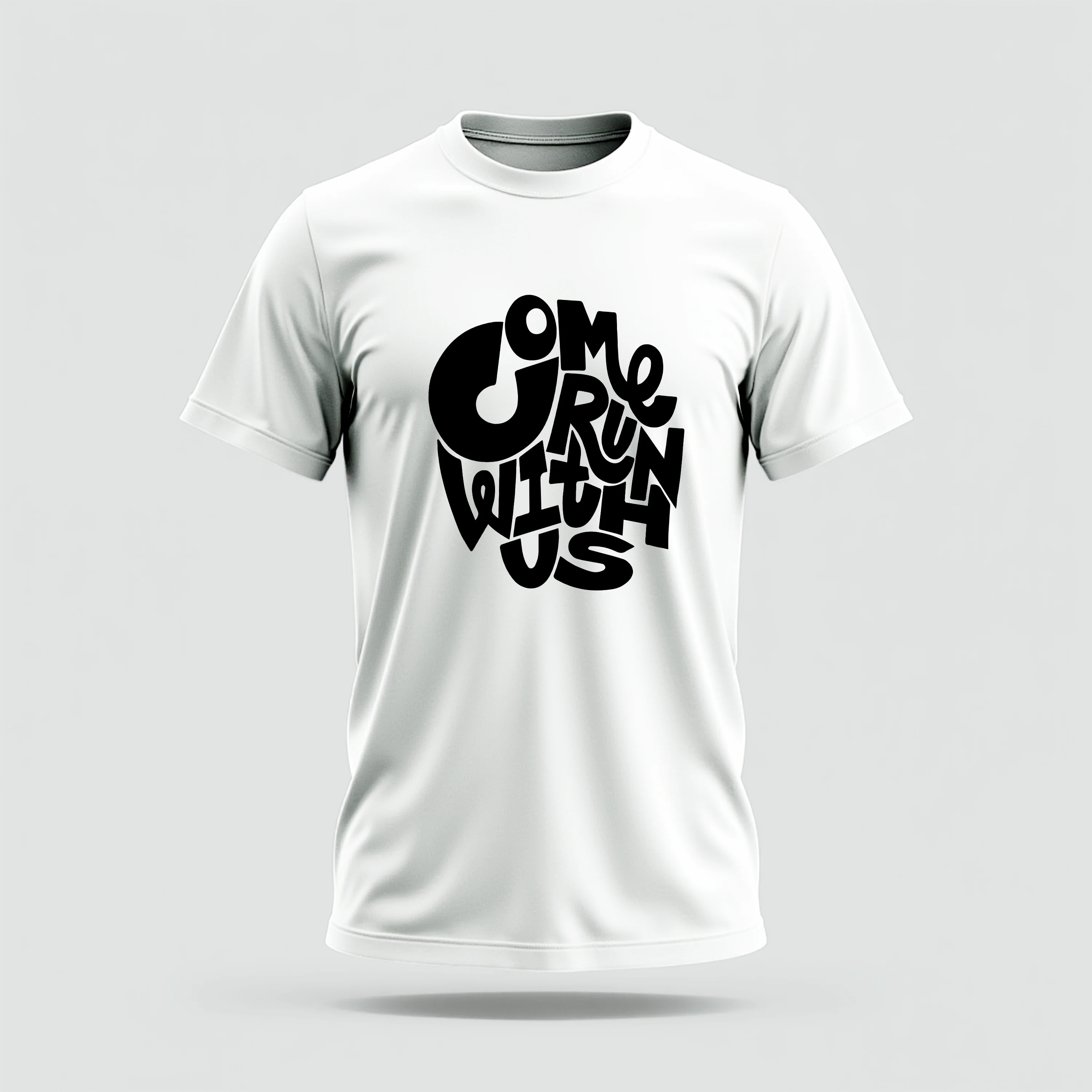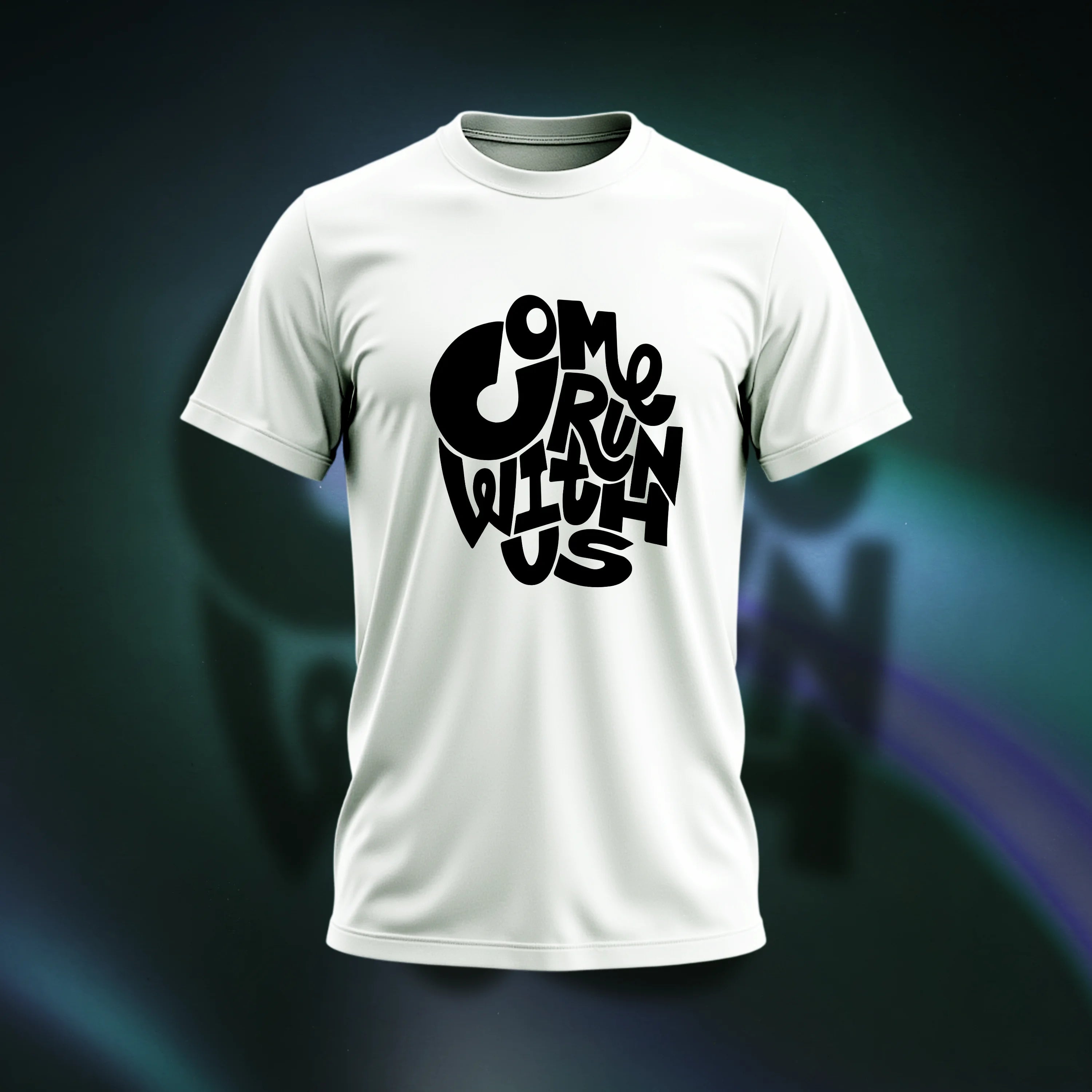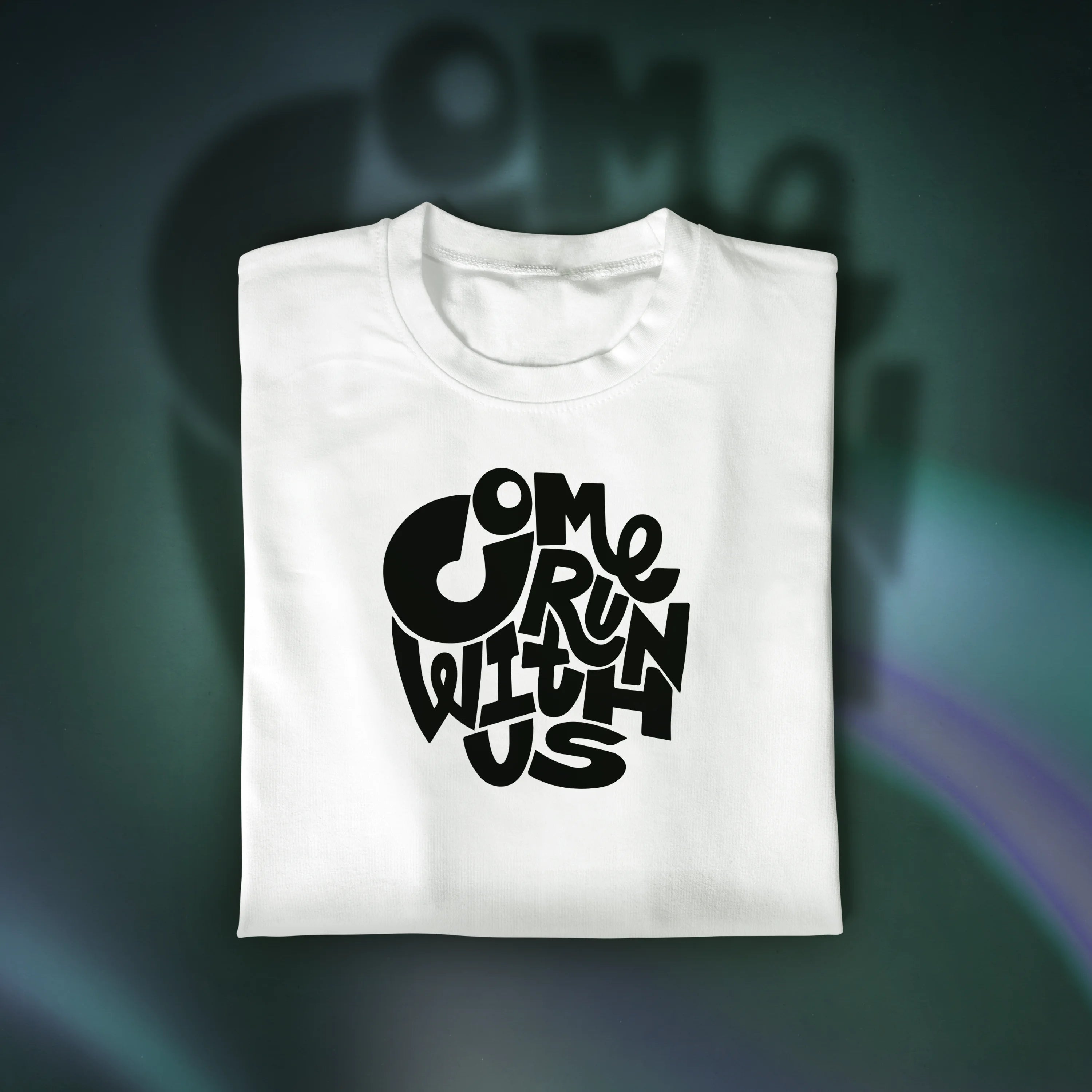 This white t-shirt features a fun and motivating graphic with the phrase "COME RUN WITH US" in a bold, circular typeface. The words are tightly packed, creating a unique and dynamic design that’s perfect for runners or anyone with an active lifestyle.