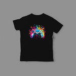 This clean white tee has a super vibrant and energetic graphic of a gaming controller. It looks like it was splattered with a rainbow of bright, happy colors! It's an artistic design that's perfect for any kid who loves to play and loves a big pop of color.