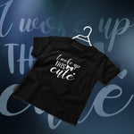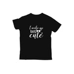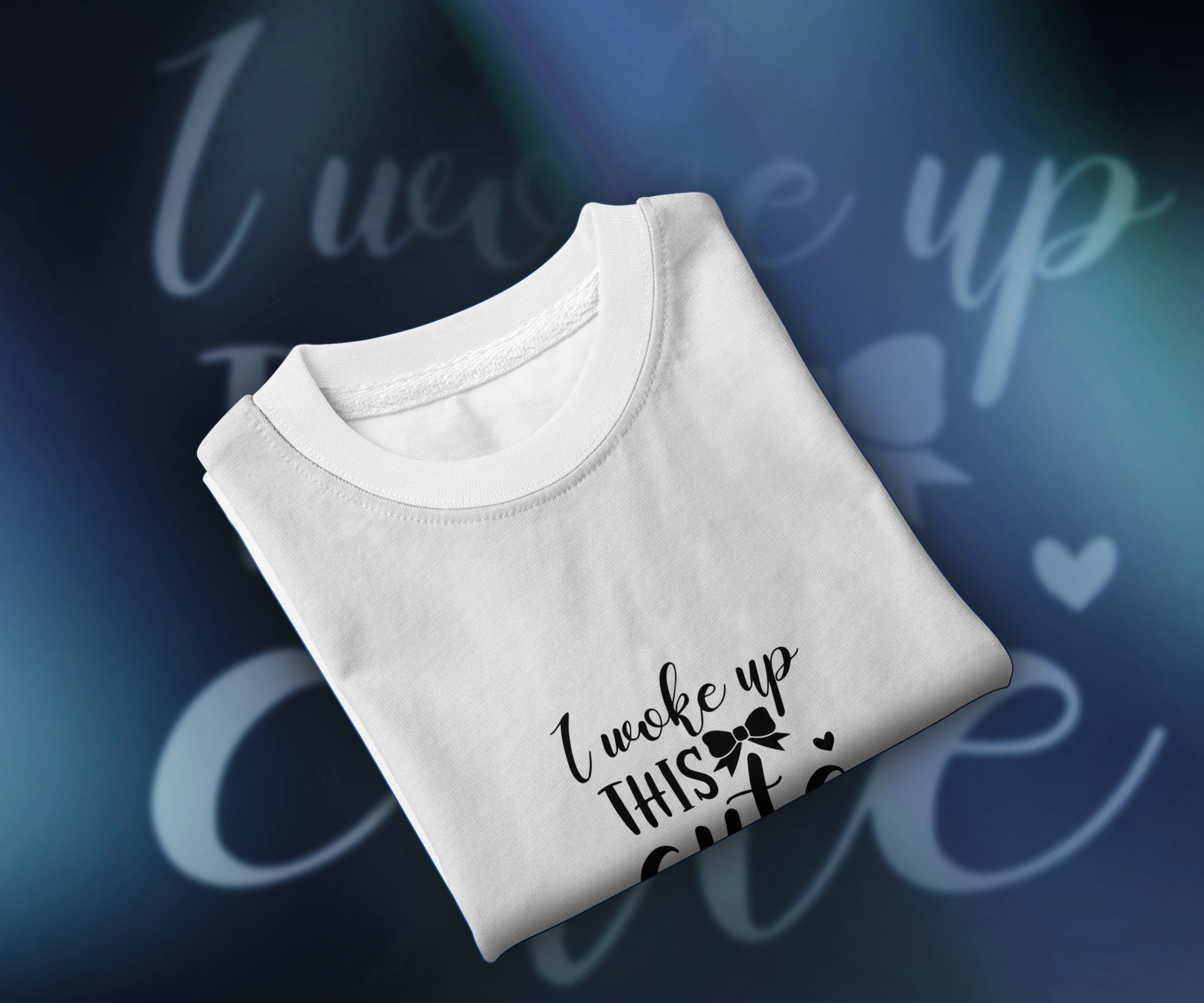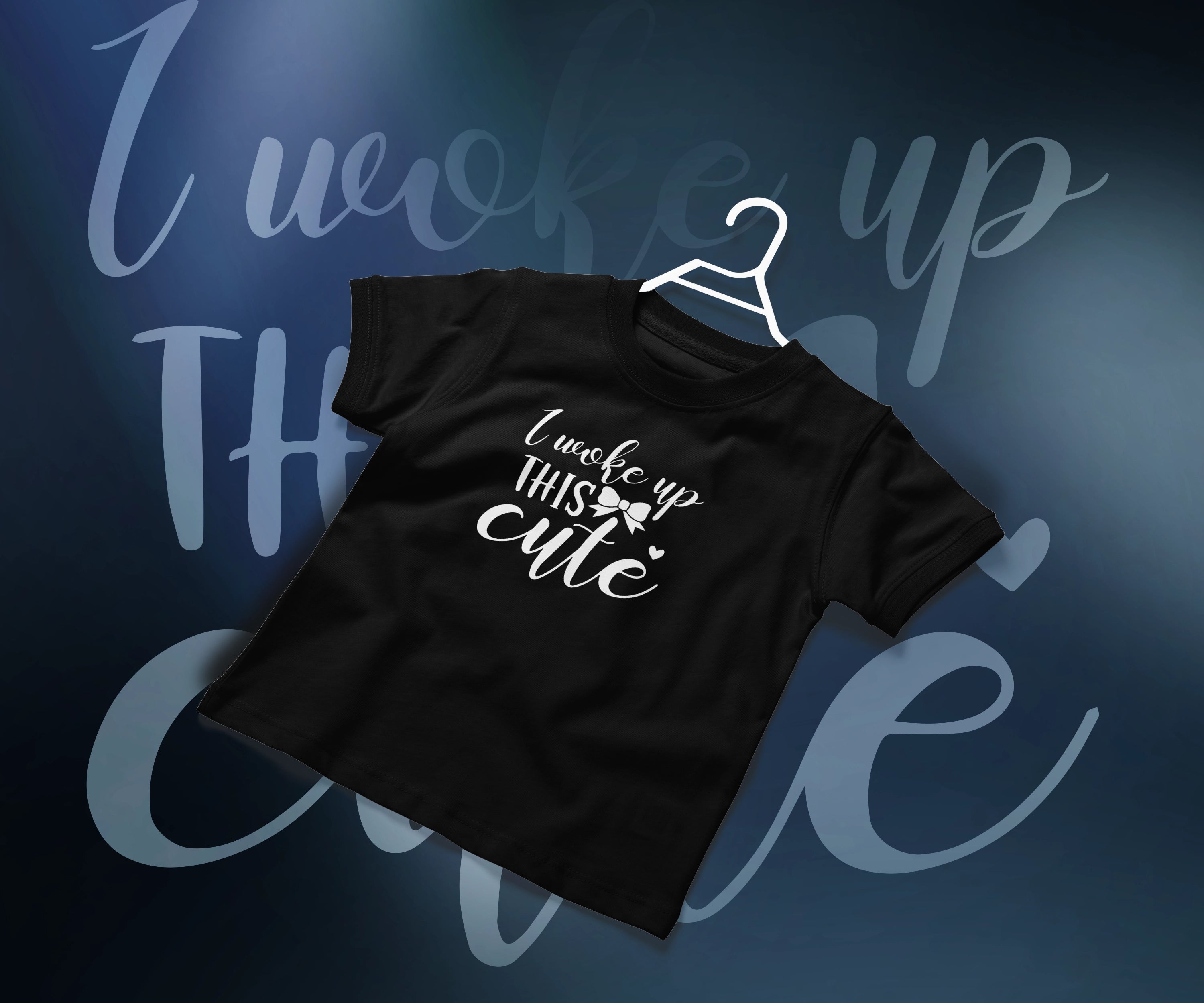 This kids' white t-shirt features a sweet and playful graphic that reads, "I woke up THIS cute." The text is printed in a stylized, cursive-like black font, with a small bow and heart graphic adding a charming touch. This design is perfect for a child's fun and lighthearted personality.
