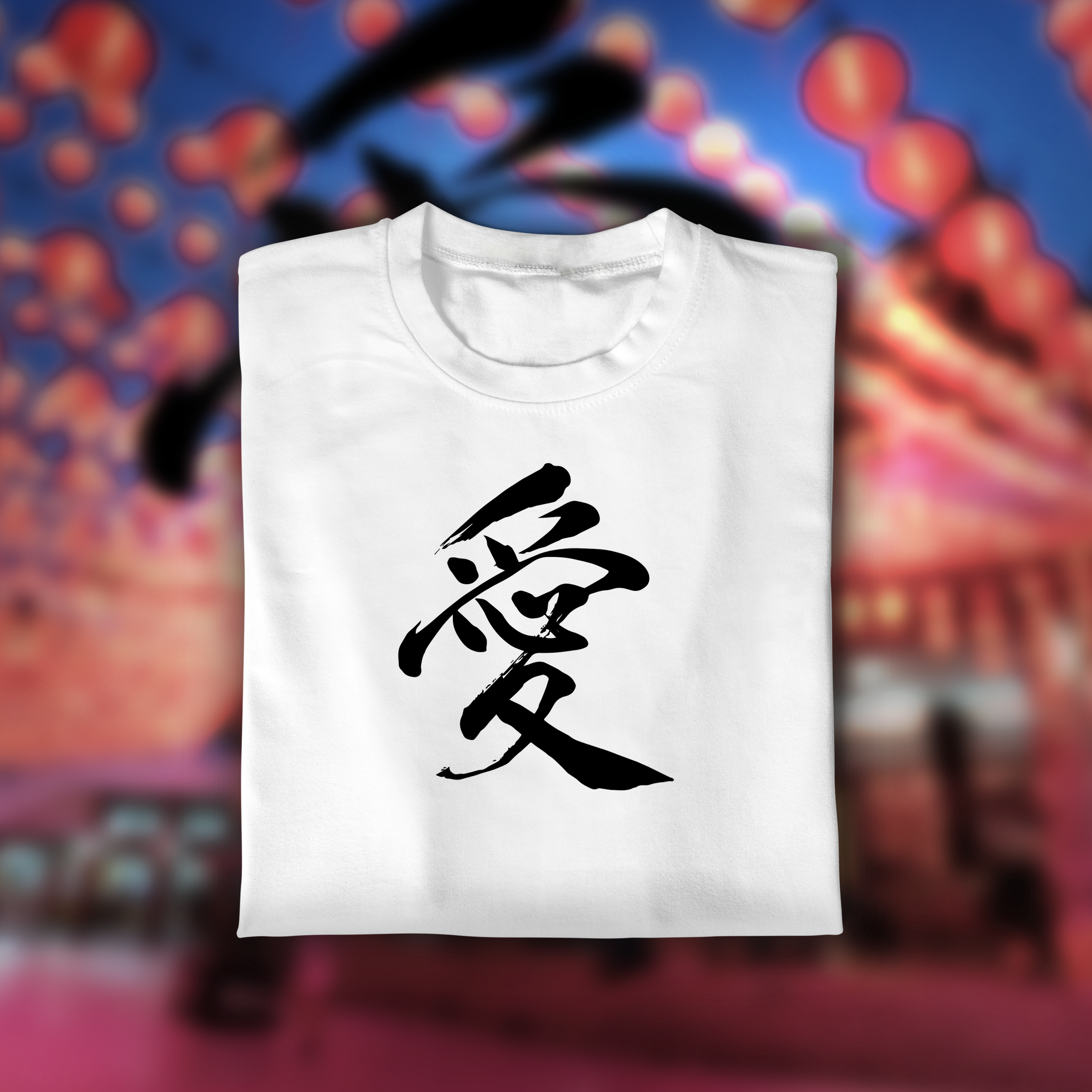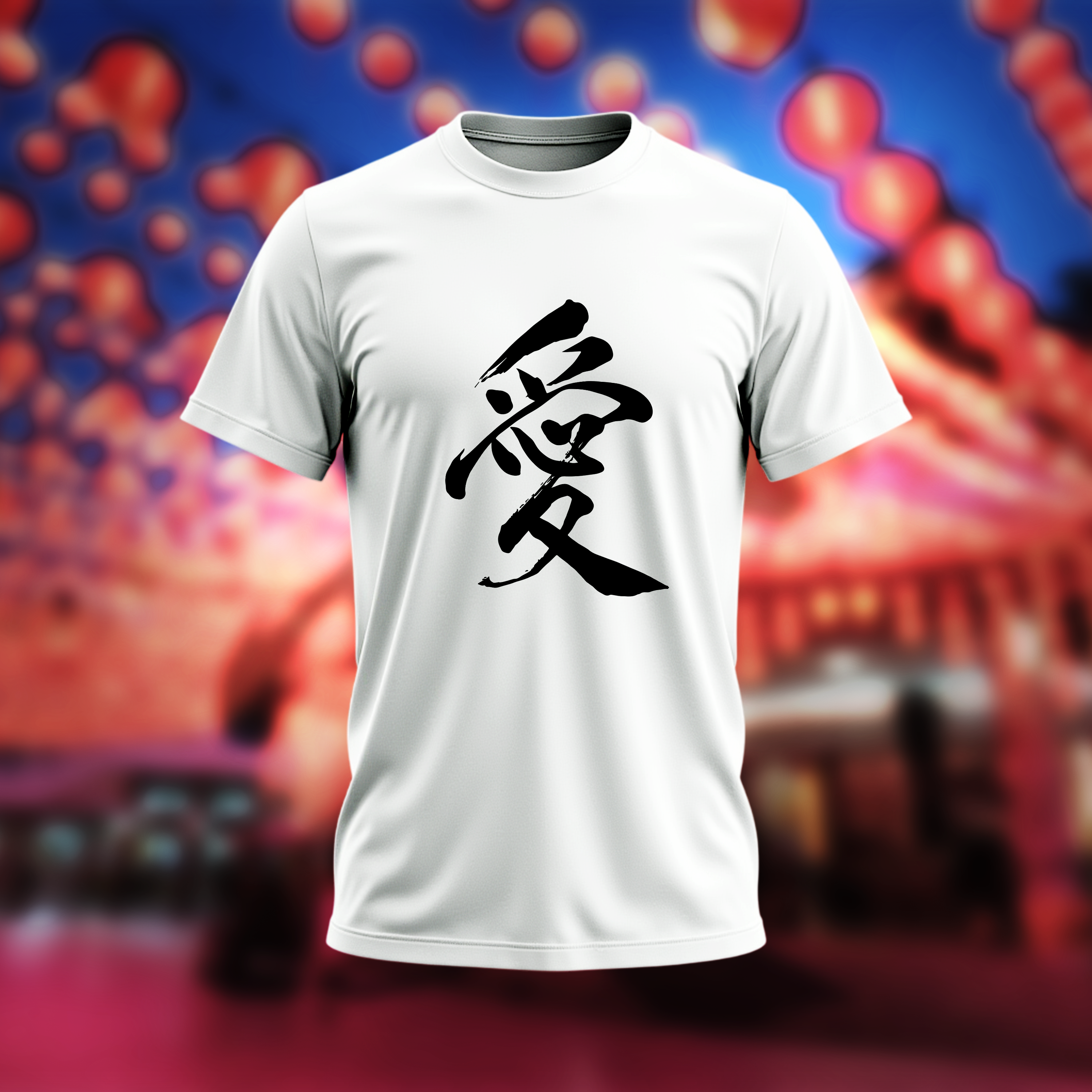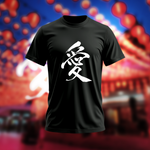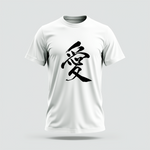 This Kanji Love T-Shirt features a striking and elegantly rendered Japanese Kanji character for "Ai" (Love) emblazoned on the front. The character is presented in a bold, brush-stroke style, giving it an artistic and authentic feel. The crisp white of the Kanji stands out dramatically against the deep black fabric of the t-shirt, ensuring the powerful message is clear and visually impactful. The design is simple yet profound, making it a sophisticated statement piece.
