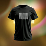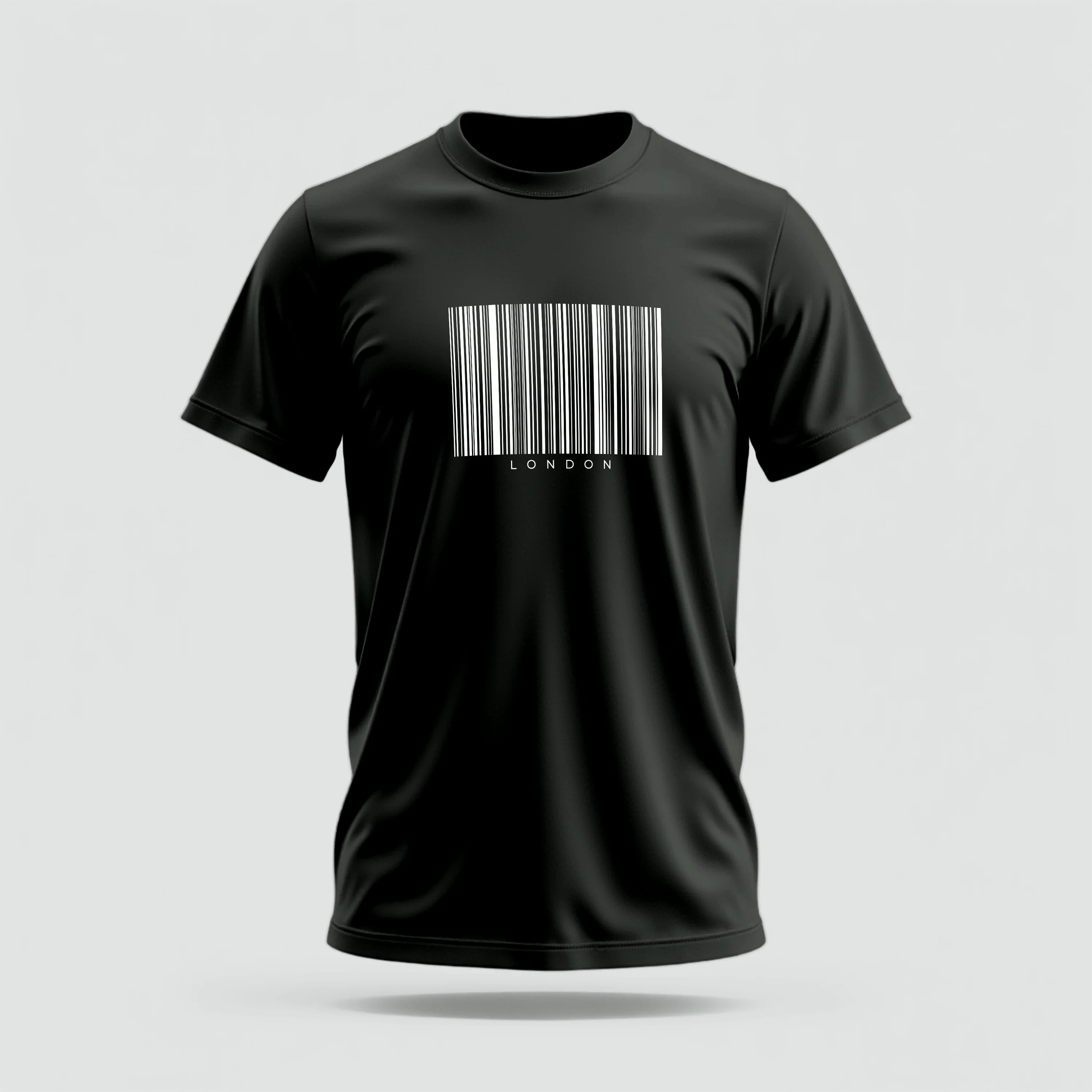 This black t-shirt features a clean and modern design. The graphic consists of a bold white barcode with the word "LONDON" printed in clean, small lettering directly underneath it. The minimalist design is a subtle and stylish tribute to the famous city.