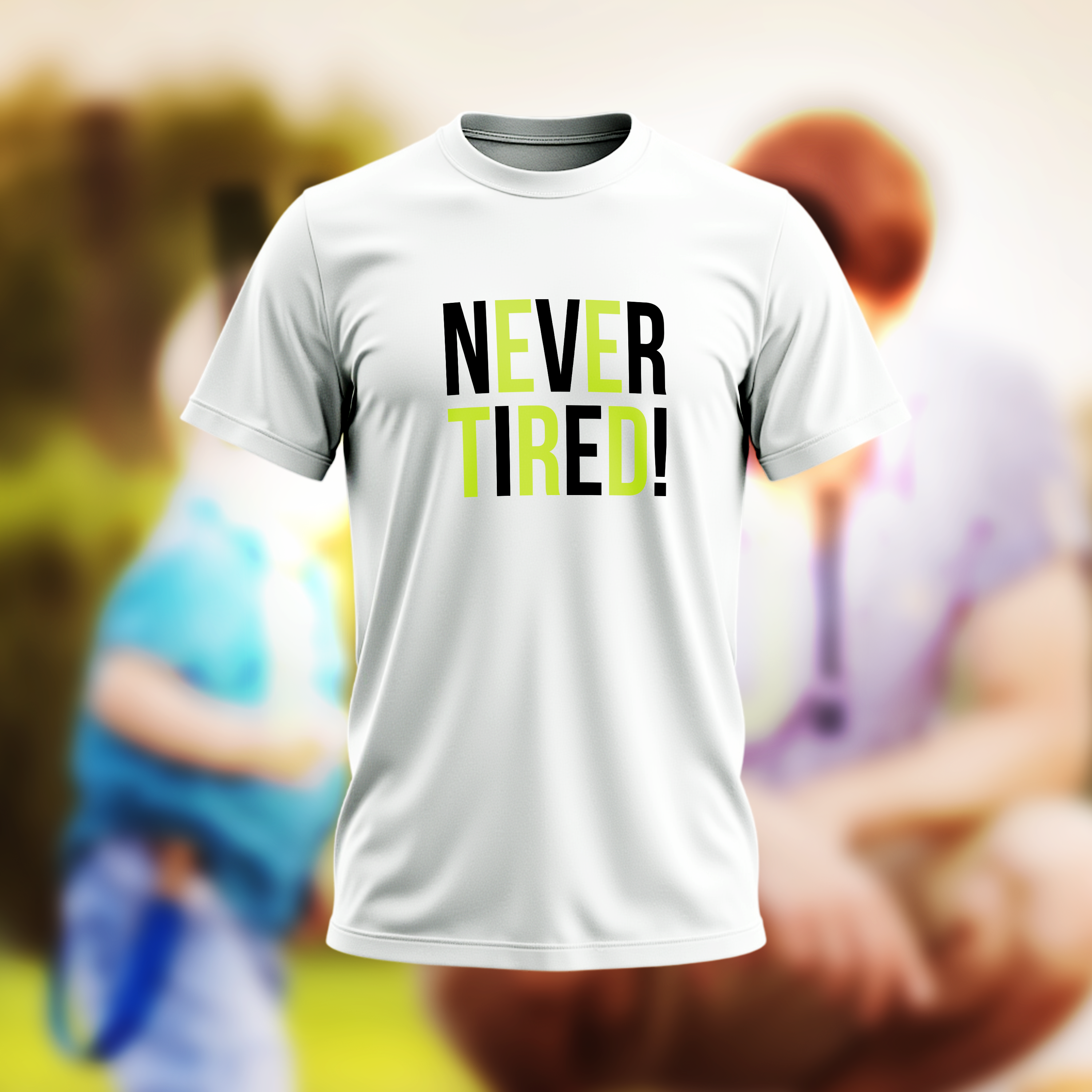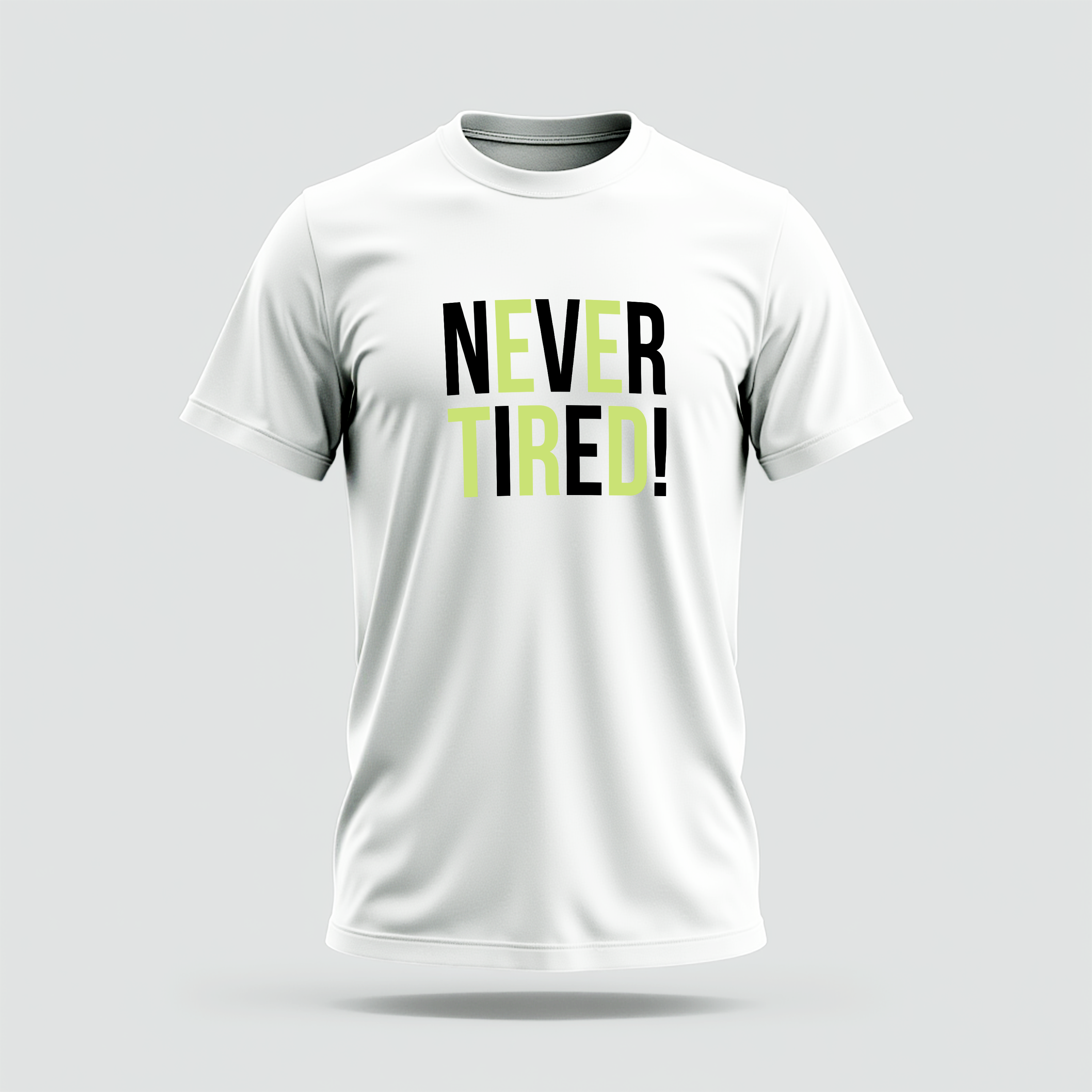 This white t-shirt features a motivational graphic in bold, two-tone typography. The word "NEVER" is printed in a light green color, while "TIRED!" is printed directly below it in black. This simple yet powerful design conveys a message of determination and energy.