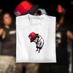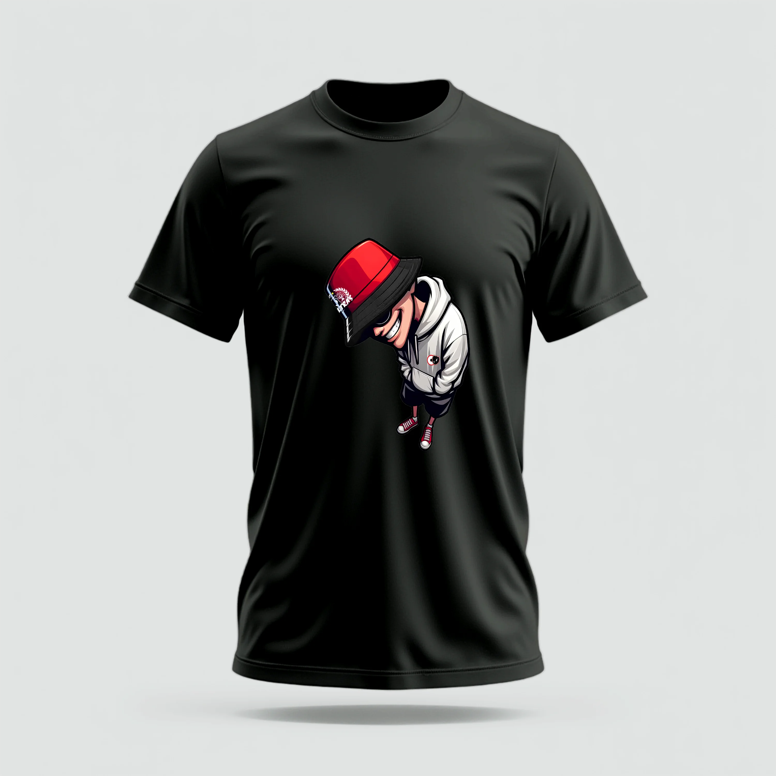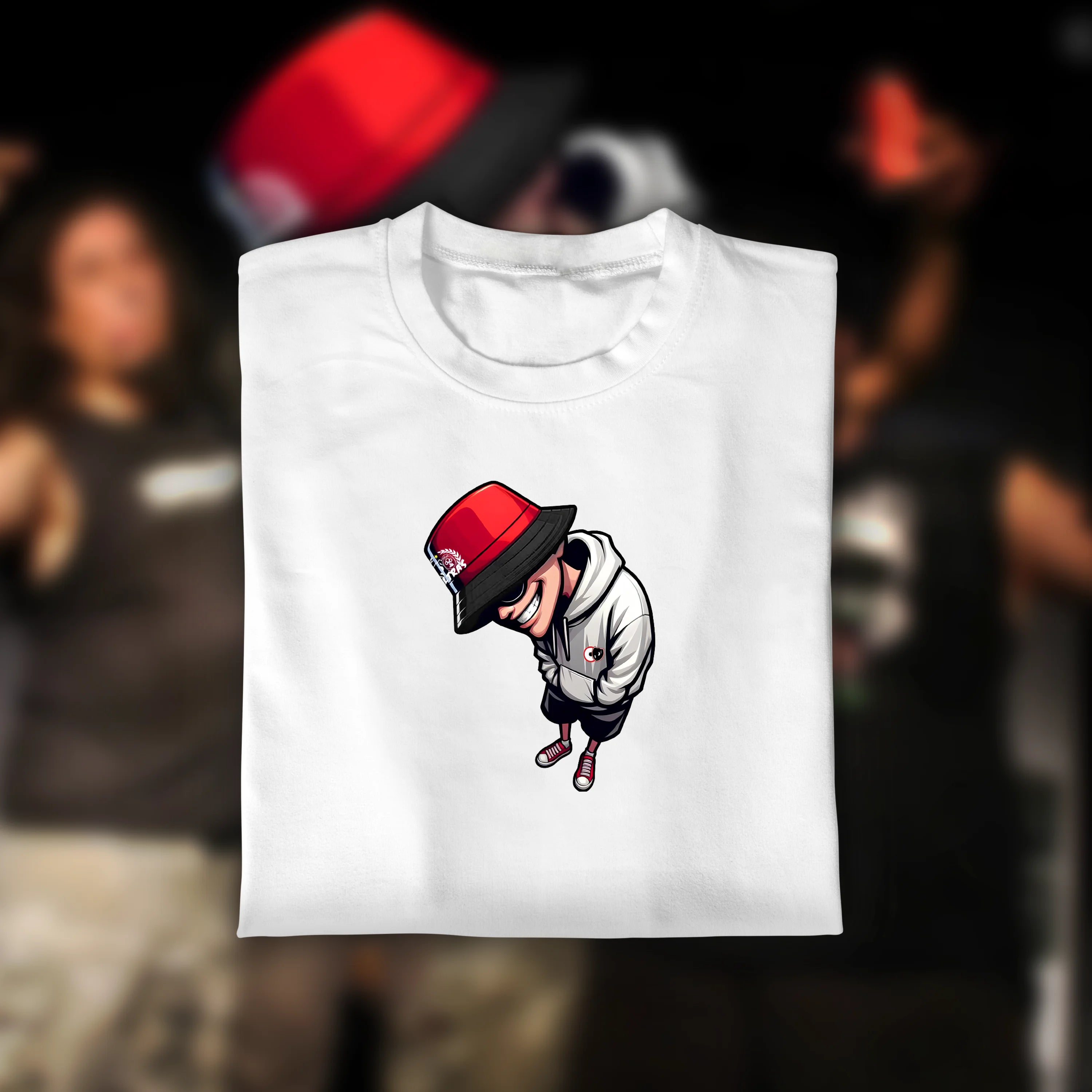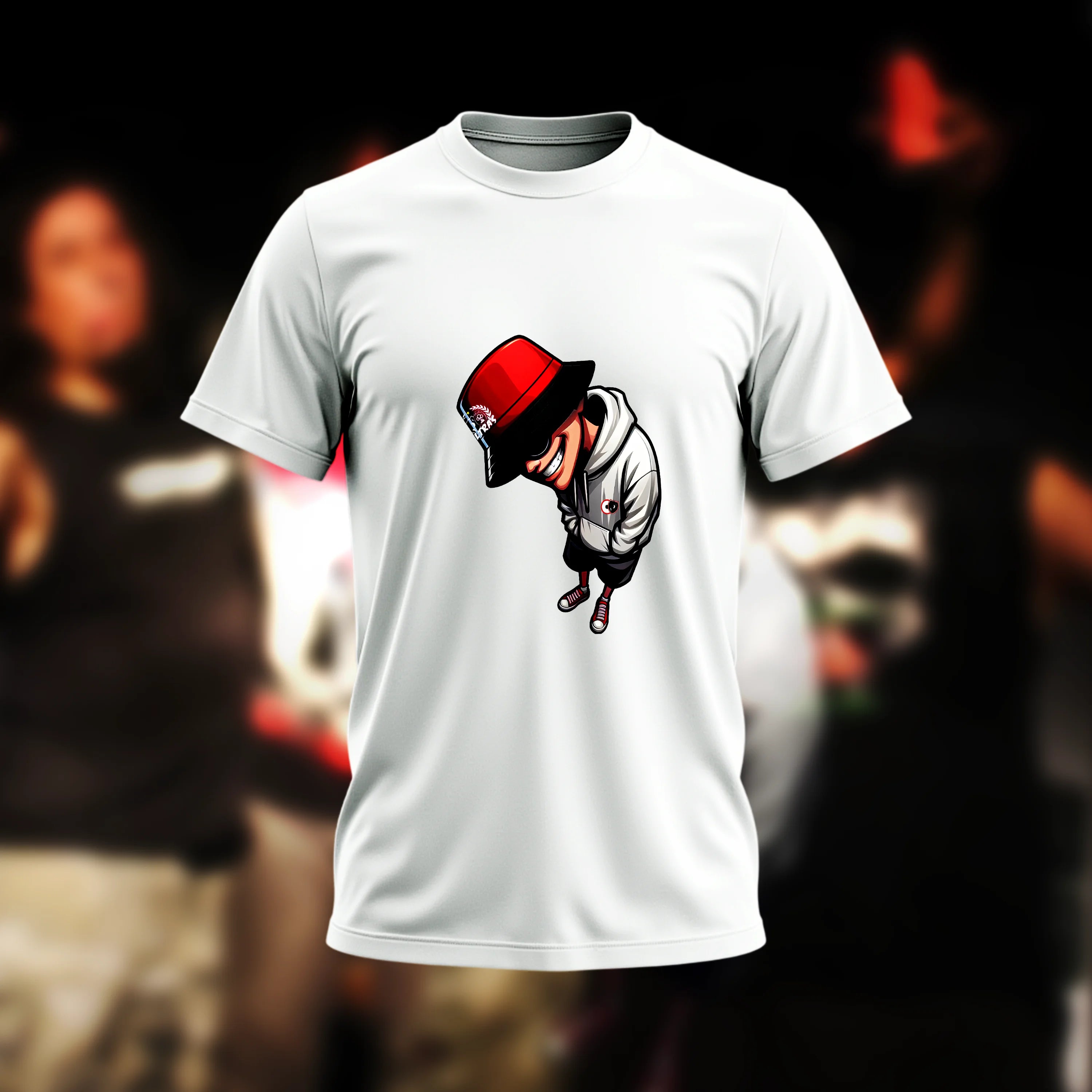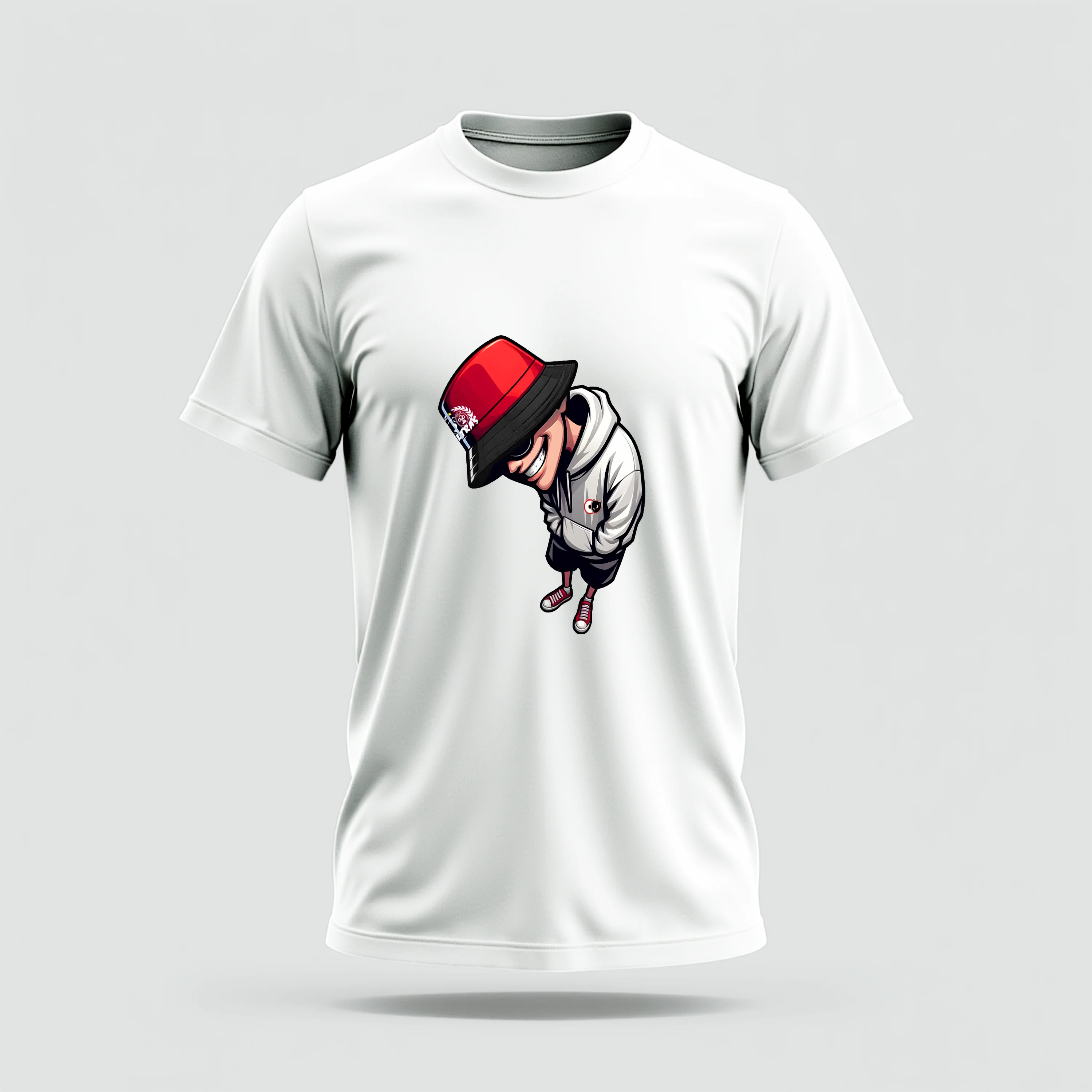 Get that cool, street-ready look with this white graphic T-shirt. It features a unique overhead cartoon illustration of a character wearing a red bucket hat and a white hoodie, capturing a confident, hip-hop vibe.