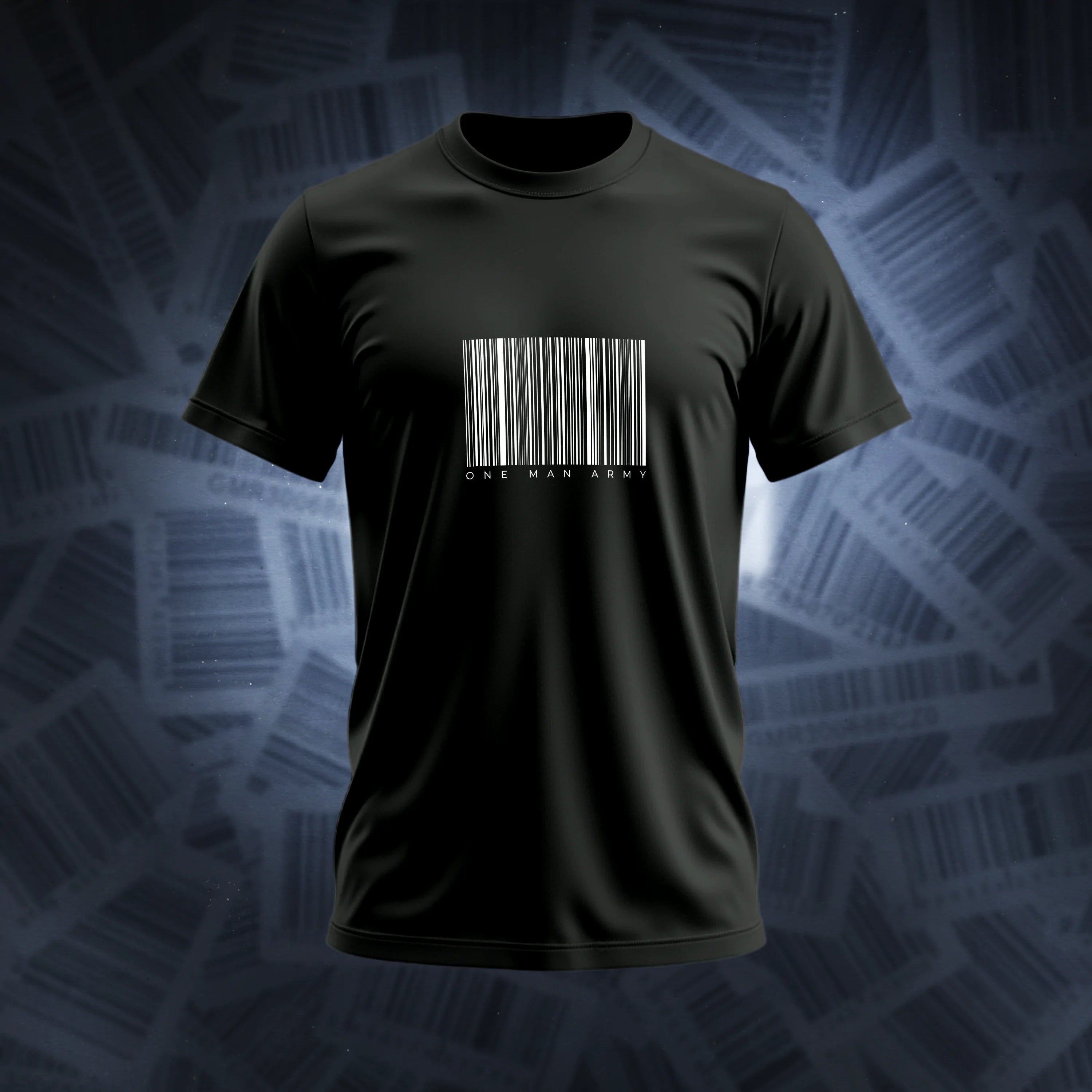 This black graphic t-shirt features a striking and minimalist design. The front of the shirt displays a stylized, white barcode with the words "ONE MAN ARMY" printed beneath it. This design creates a sharp contrast against the black fabric, giving the shirt a bold and modern look.