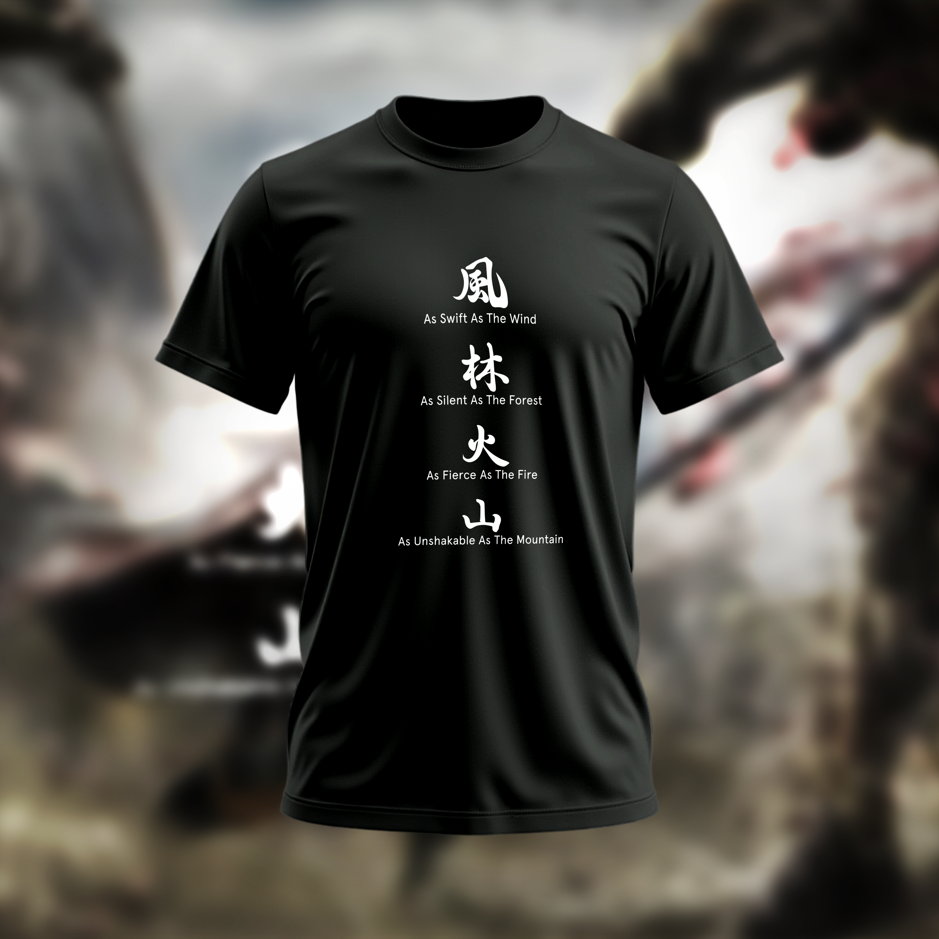 Embrace the ancient wisdom of Sun Tzu. This powerful T-shirt features the four elements of strategic action: Wind (Swift), Forest (Silent), Fire (Fierce), and Mountain (Unshakable). The bold, black calligraphy on a crisp white shirt offers a minimalist yet striking statement of strength and resolve. Perfect for martial arts enthusiasts or strategic thinkers.