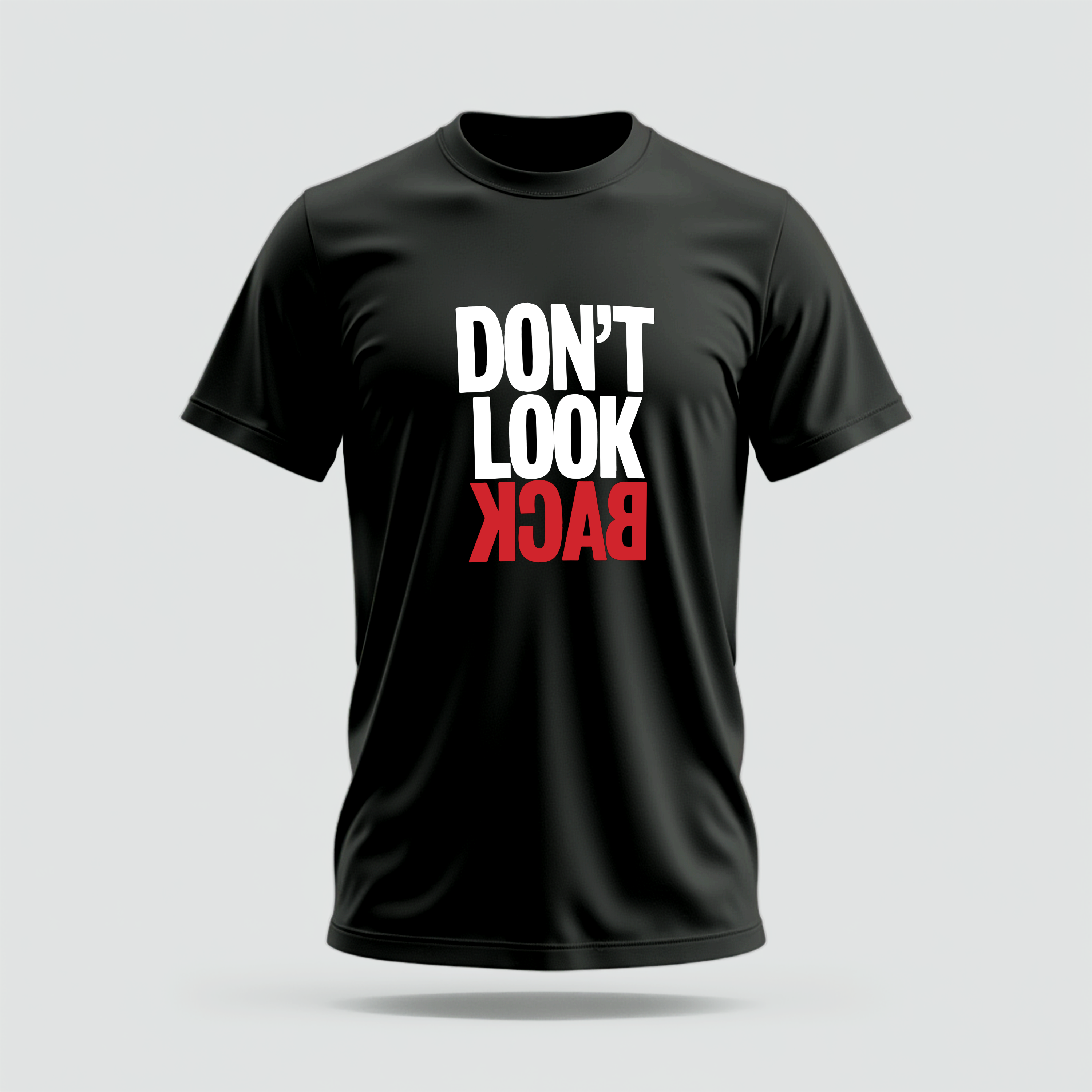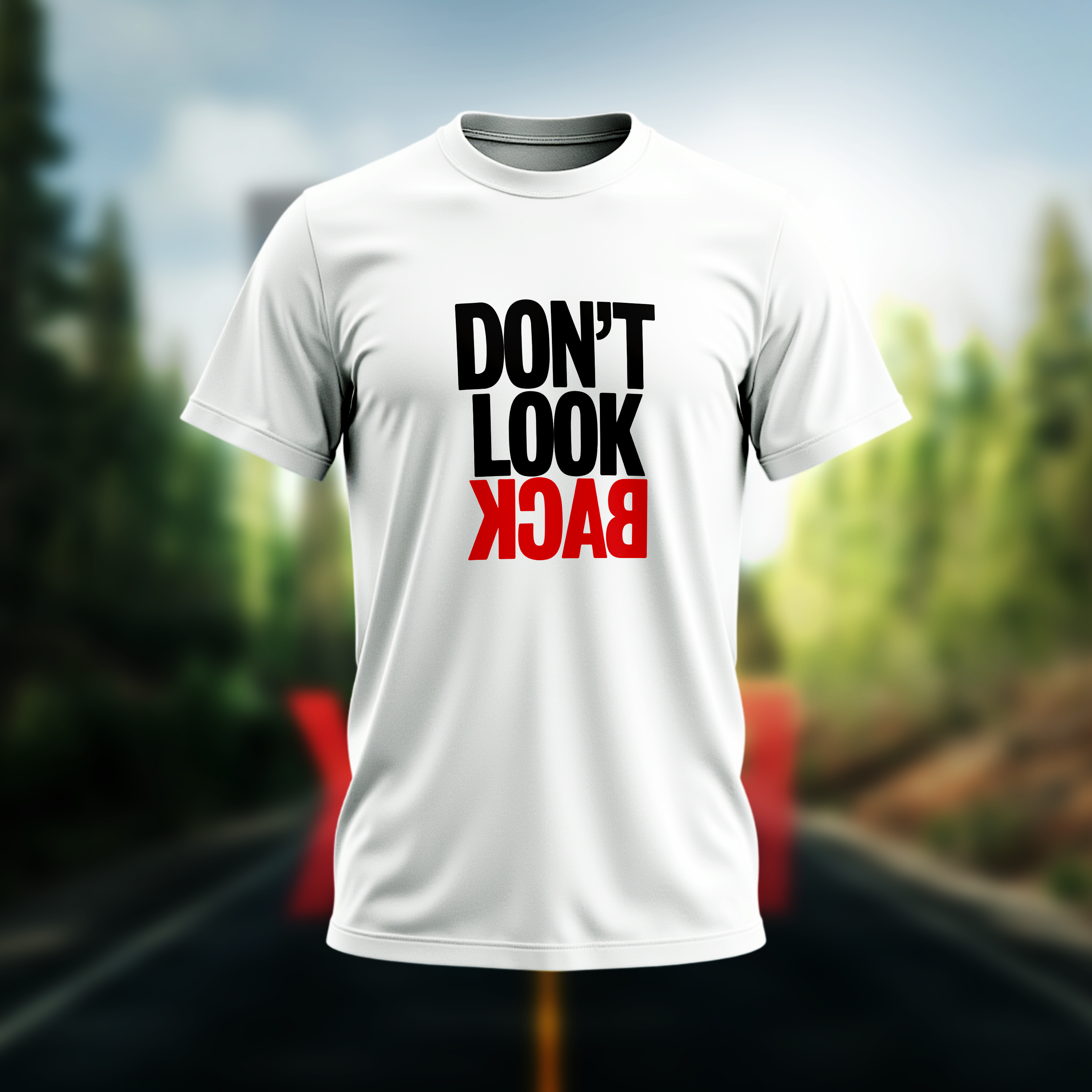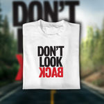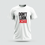 This white t-shirt features a powerful and motivating message. The text "DON'T LOOK" is printed in bold black letters, while "BACK" is printed below it in a striking red color and mirrored upside down. The unique design adds an eye-catching twist to a classic motivational phrase.