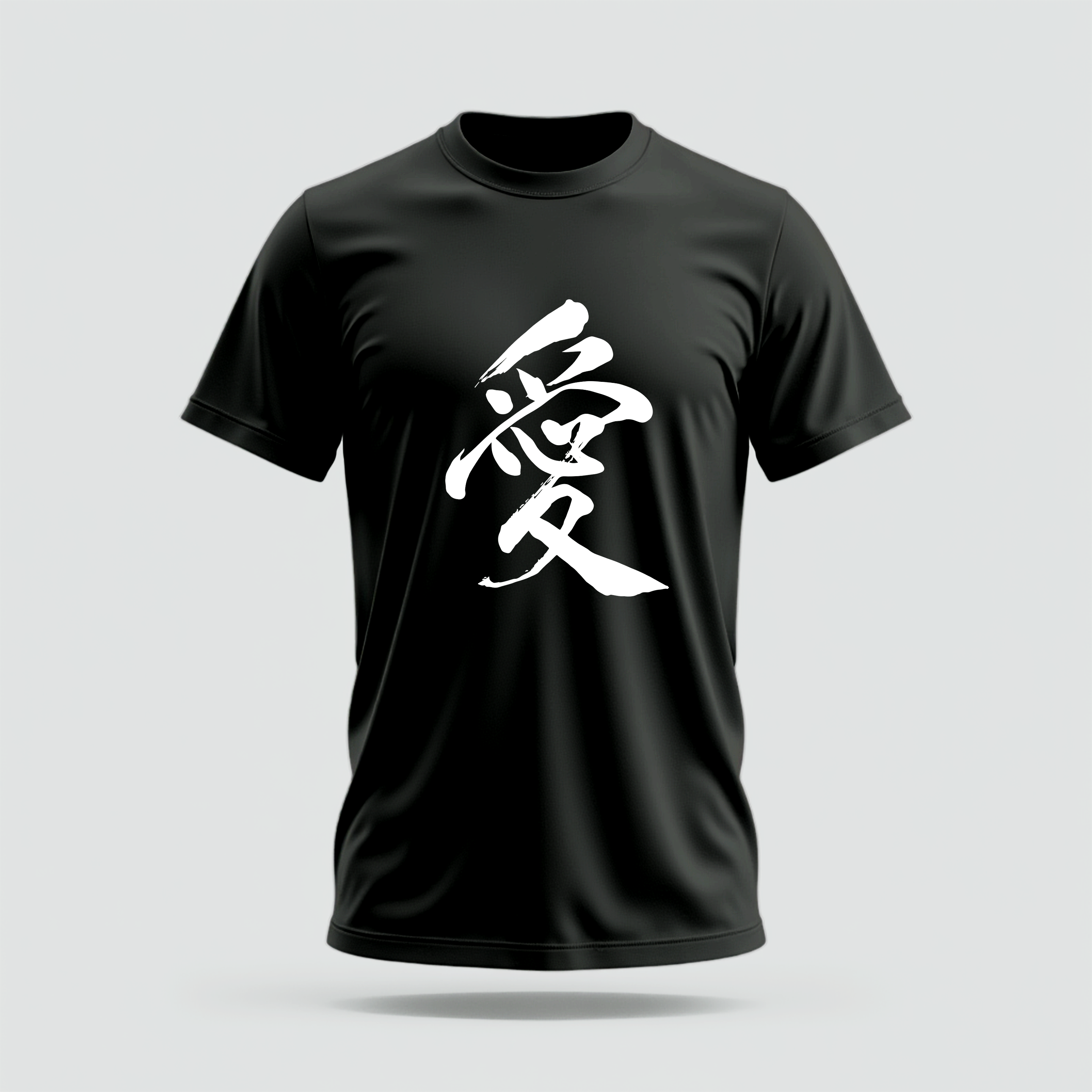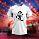 This Kanji Love T-Shirt features a striking and elegantly rendered Japanese Kanji character for "Ai" (Love) emblazoned on the front. The character is presented in a bold, brush-stroke style, giving it an artistic and authentic feel. The crisp white of the Kanji stands out dramatically against the deep black fabric of the t-shirt, ensuring the powerful message is clear and visually impactful. The design is simple yet profound, making it a sophisticated statement piece.