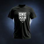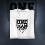 This black t-shirt features a powerful, distressed graphic with the phrase "ONE MAN ARMY." The text is contained within a shield-like emblem with a small star at the bottom, giving the design a rugged and military-inspired feel. The worn-out texture of the print adds to its tough, resilient aesthetic.