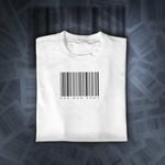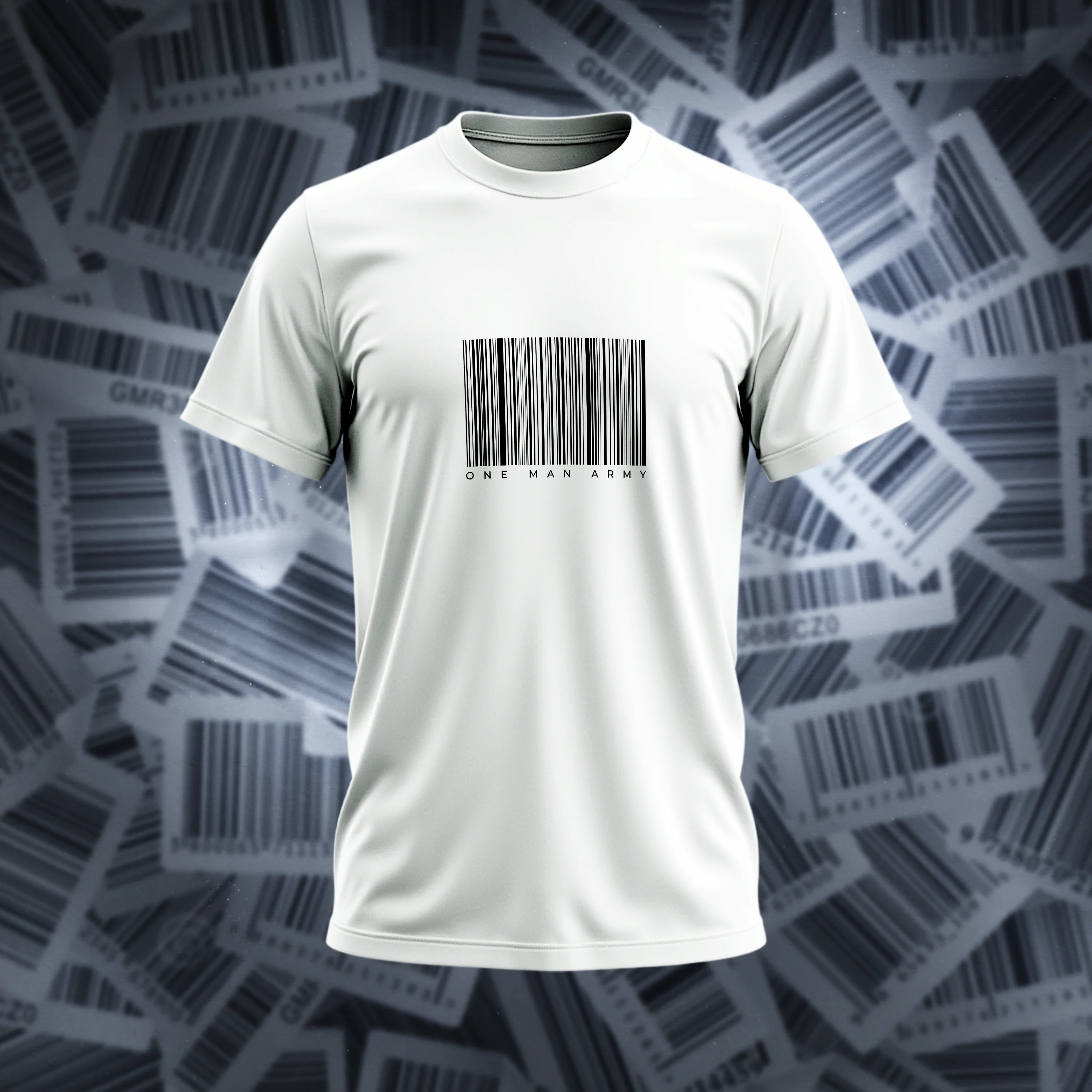 This black graphic t-shirt features a striking and minimalist design. The front of the shirt displays a stylized, white barcode with the words "ONE MAN ARMY" printed beneath it. This design creates a sharp contrast against the black fabric, giving the shirt a bold and modern look.