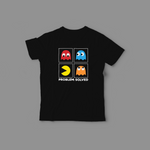 This cool black tee features a bright, colorful graphic inspired by the classic arcade game. You'll see a grid with Pac-Man and his famous ghost pals (Blinky, Inky, and Clyde) ready to chase and be chased! Below the action, the funny phrase "PROBLEM SOLVED" is printed, just like finishing a level.
