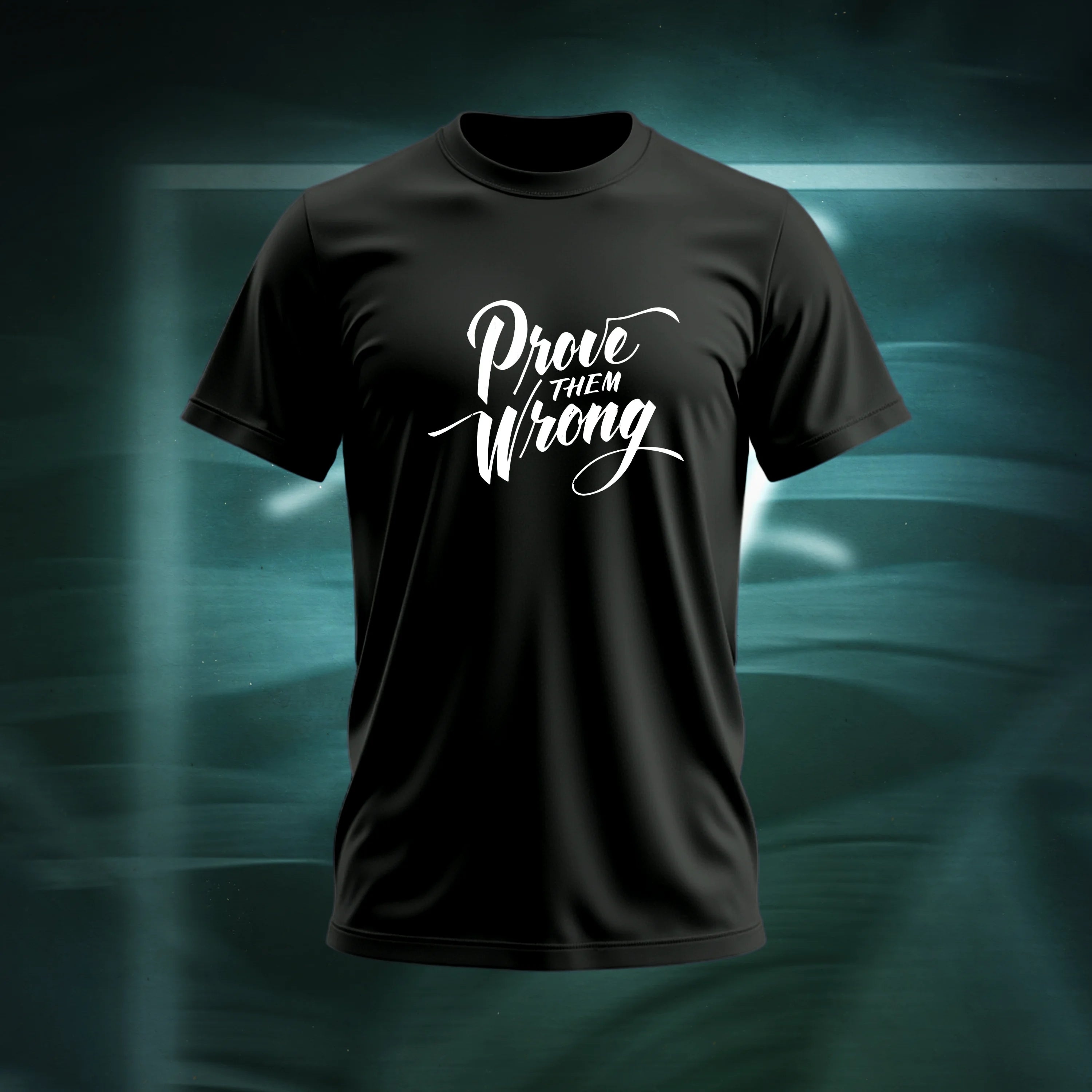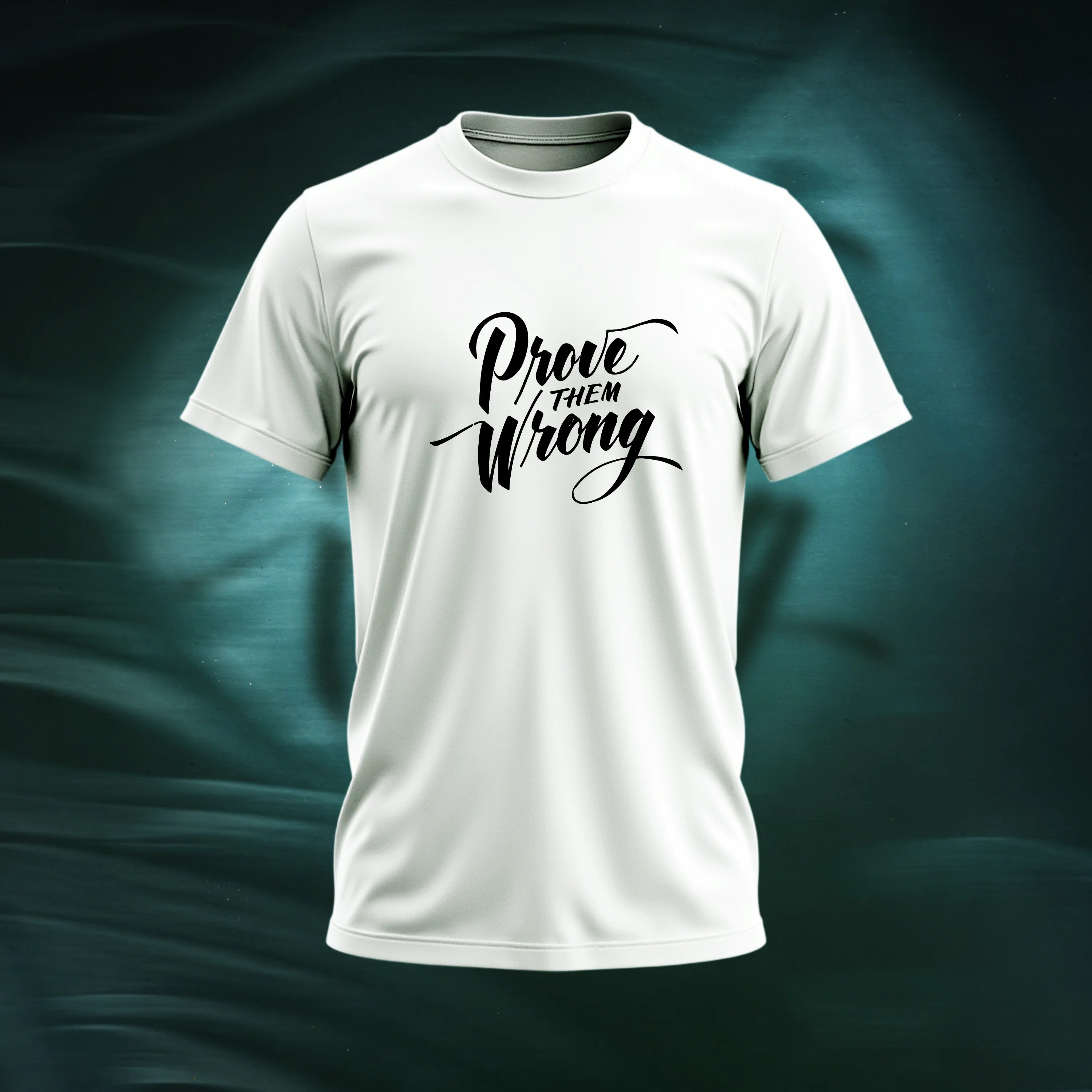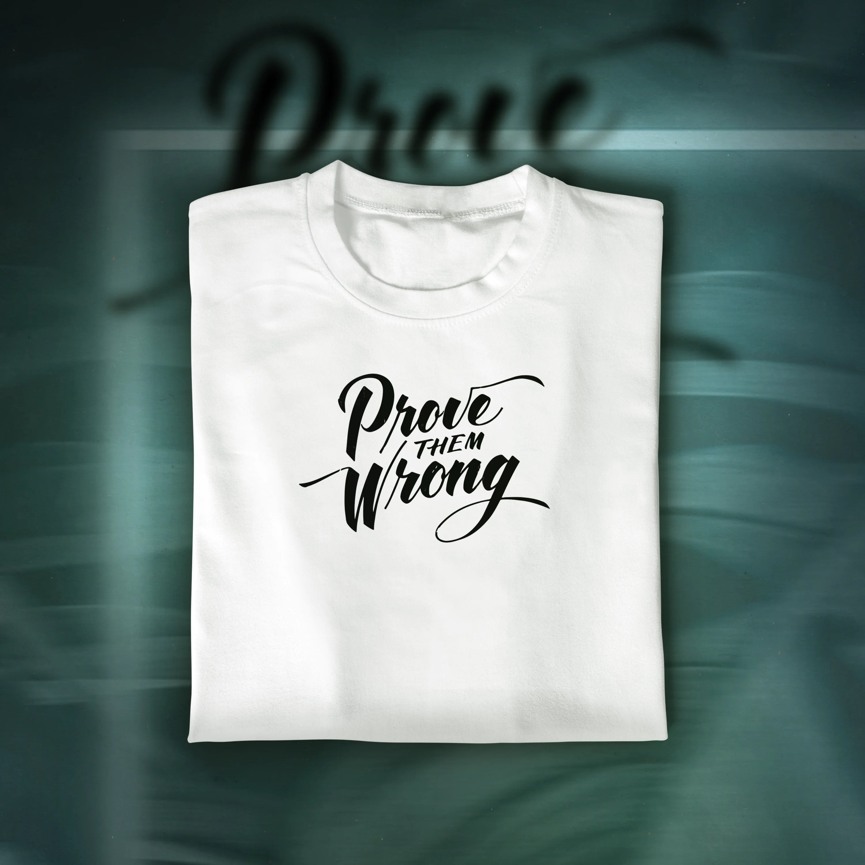 This white t-shirt features a powerful and motivating message with the phrase "Prove Them Wrong" in a bold, calligraphic font. The elegant script adds a touch of style to the inspirational statement, making it a great choice for those who are driven by a challenge.