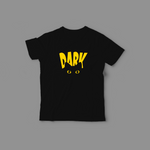 The word "DARK" is written on the front in a fun, drippy style—like it's melting! Right below it are two bright, glowing yellow eyes that look like a mysterious, cool cat. It's a bold and striking design that's sure to stand out!