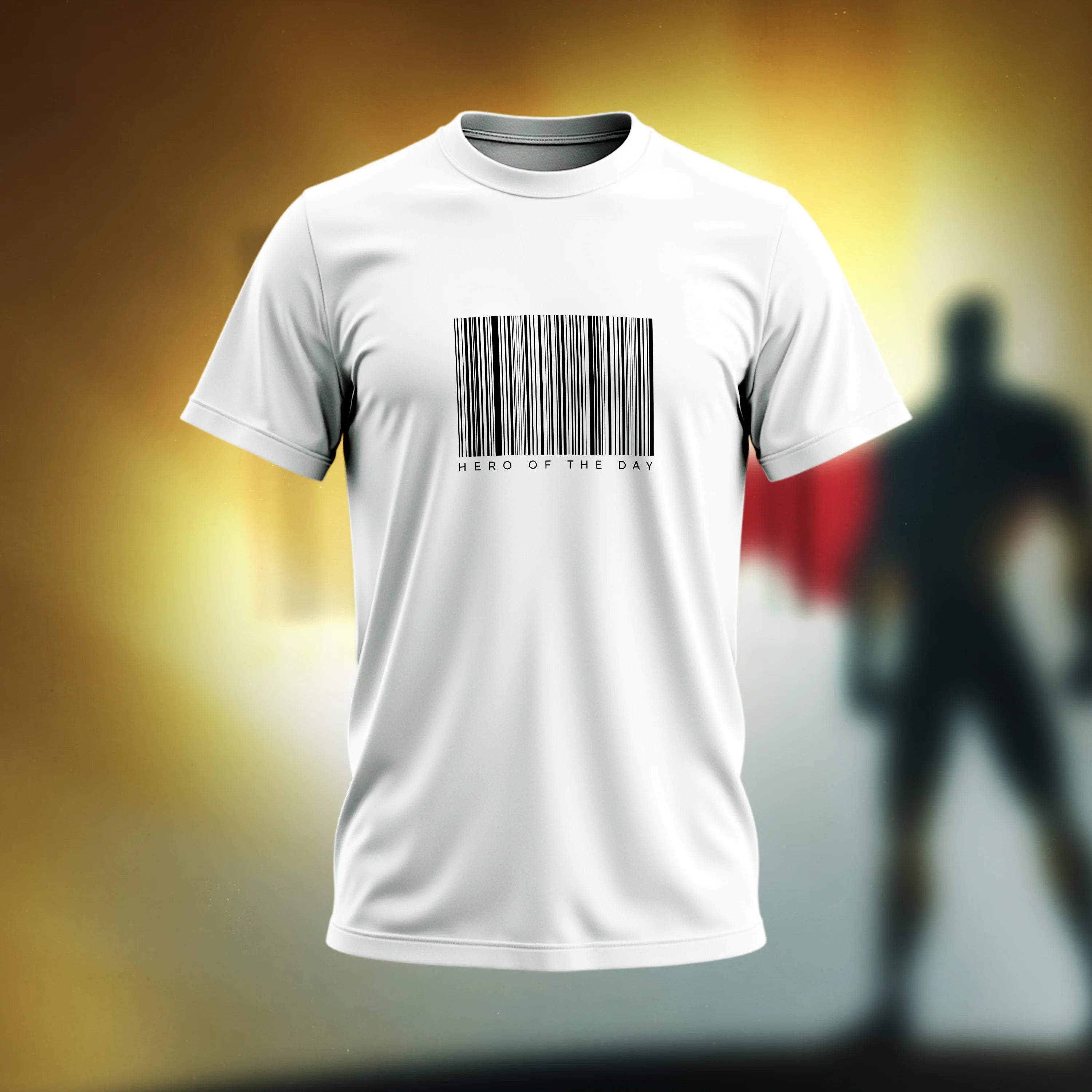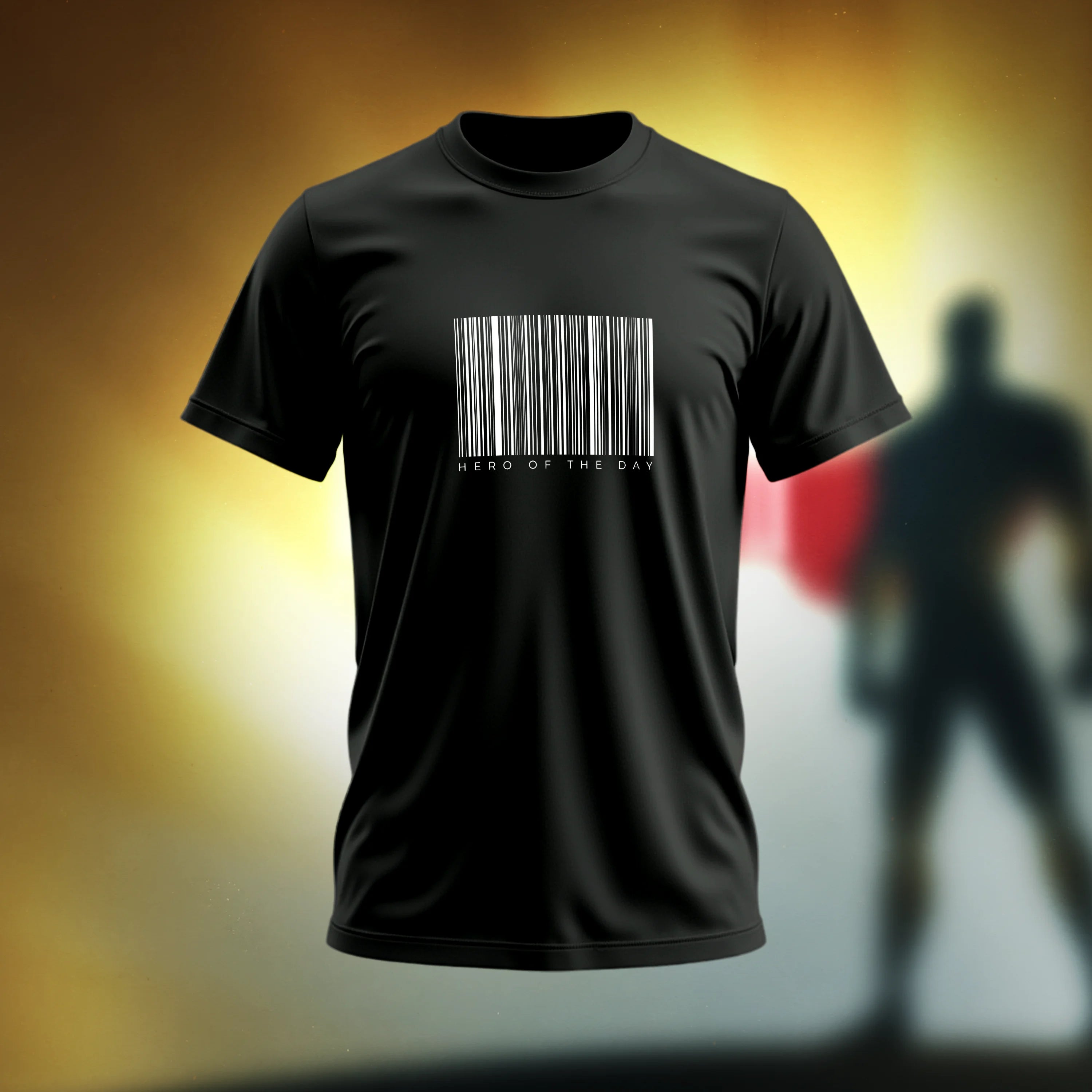 This black t-shirt features a striking, clean, and minimalist design on its solid background. Centered on the chest is a bold white barcode graphic, a modern symbol of identity and data. Below the barcode, the phrase "HERO OF THE DAY" is printed in a simple, refined uppercase font. This text adds a meaningful and thought-provoking layer, transforming the universal barcode into a personal statement of recognition and empowerment. The high-contrast black and white color scheme gives the shirt a sleek, timeless, and versatile look. Made from a comfortable and durable, The t-shirt is made from a comfortable and soft, breathable fabric making it perfect for everyday wear.