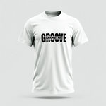 This white graphic t-shirt features a minimalist, bold design with the phrase "MAKE ME GROOVE" printed in black on the front. The font is a striking, geometric sans-serif style that gives the shirt a modern, edgy look.