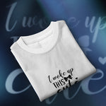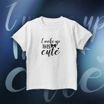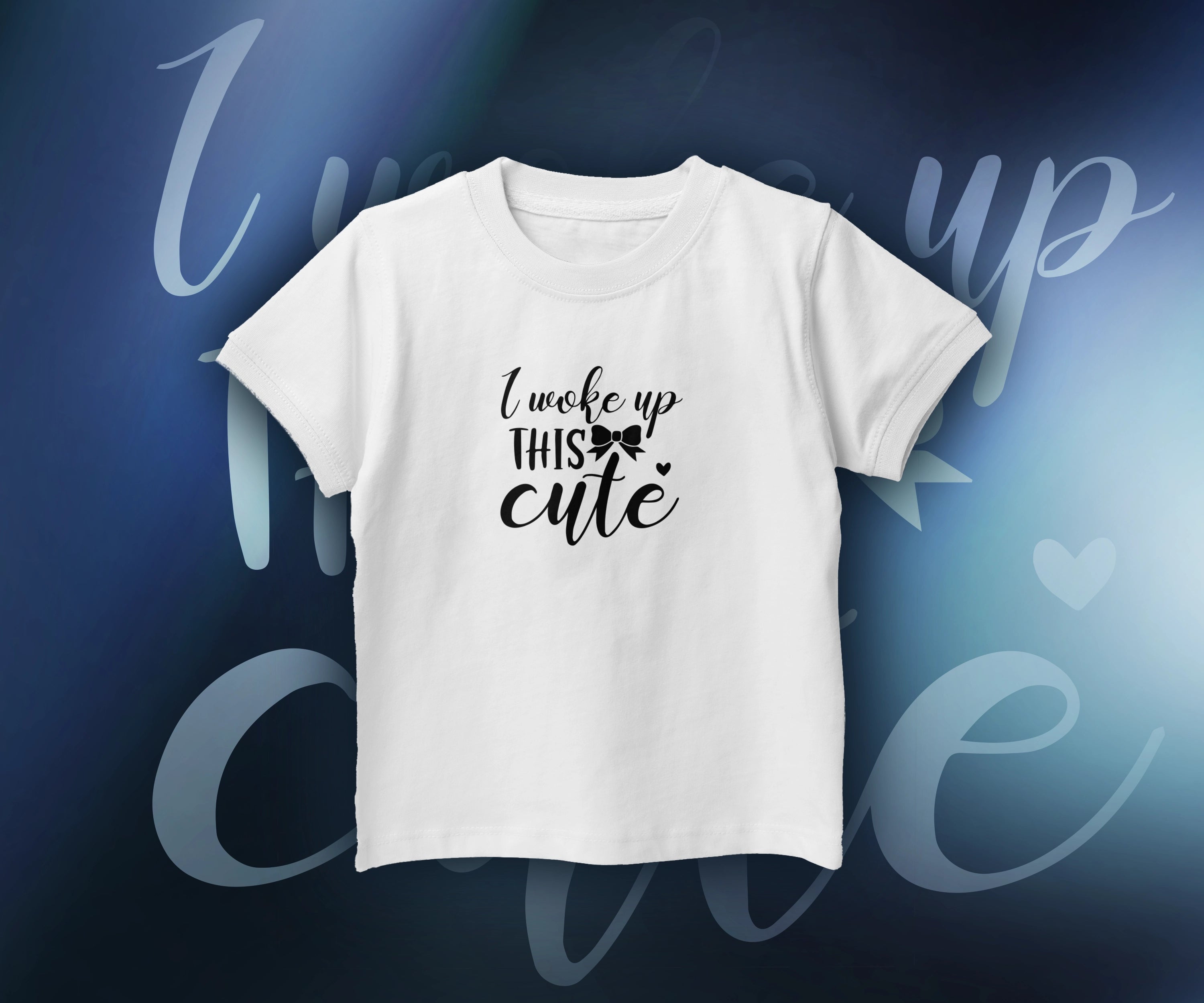 This kids' white t-shirt features a sweet and playful graphic that reads, "I woke up THIS cute." The text is printed in a stylized, cursive-like black font, with a small bow and heart graphic adding a charming touch. This design is perfect for a child's fun and lighthearted personality.